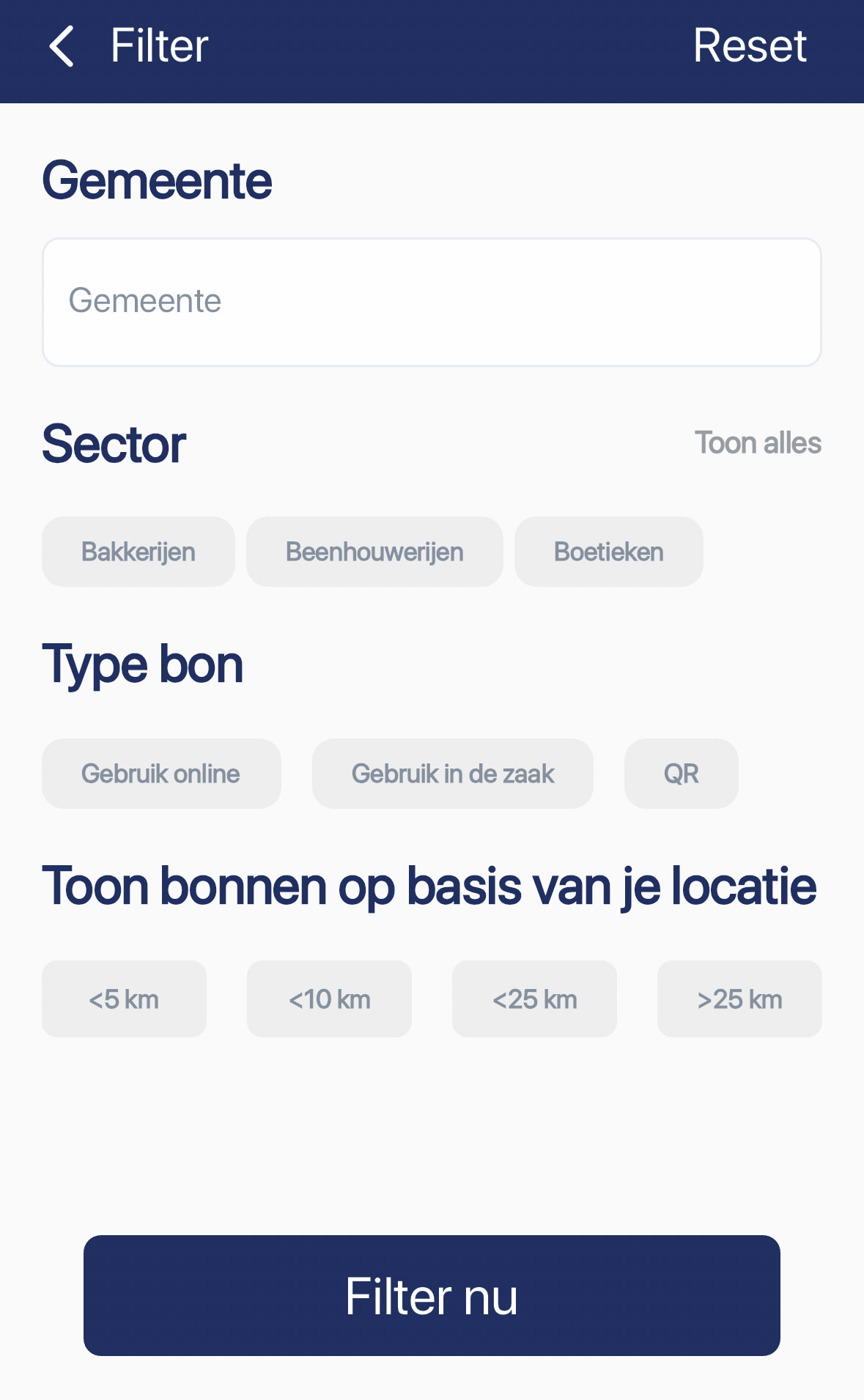 Ben je op zoek naar een bon uit een specifieke gemeente, wil je enkel bonnen zien van bepaalde sectoren? Ben je aan het shoppen en wil je ontdekken welke bonnen er beschikbaar zijn in de buurt, dan maak je gebruik van een filter.
