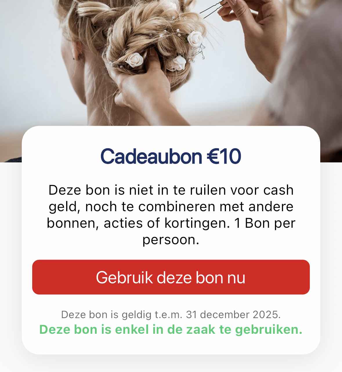 Een bon kan maar één keer gebruikt worden en is strikt persoonlijk. Een bon die gebruikt is, kun je terugvinden onder "Mijn bonnen" in het tabblad gebruikt.