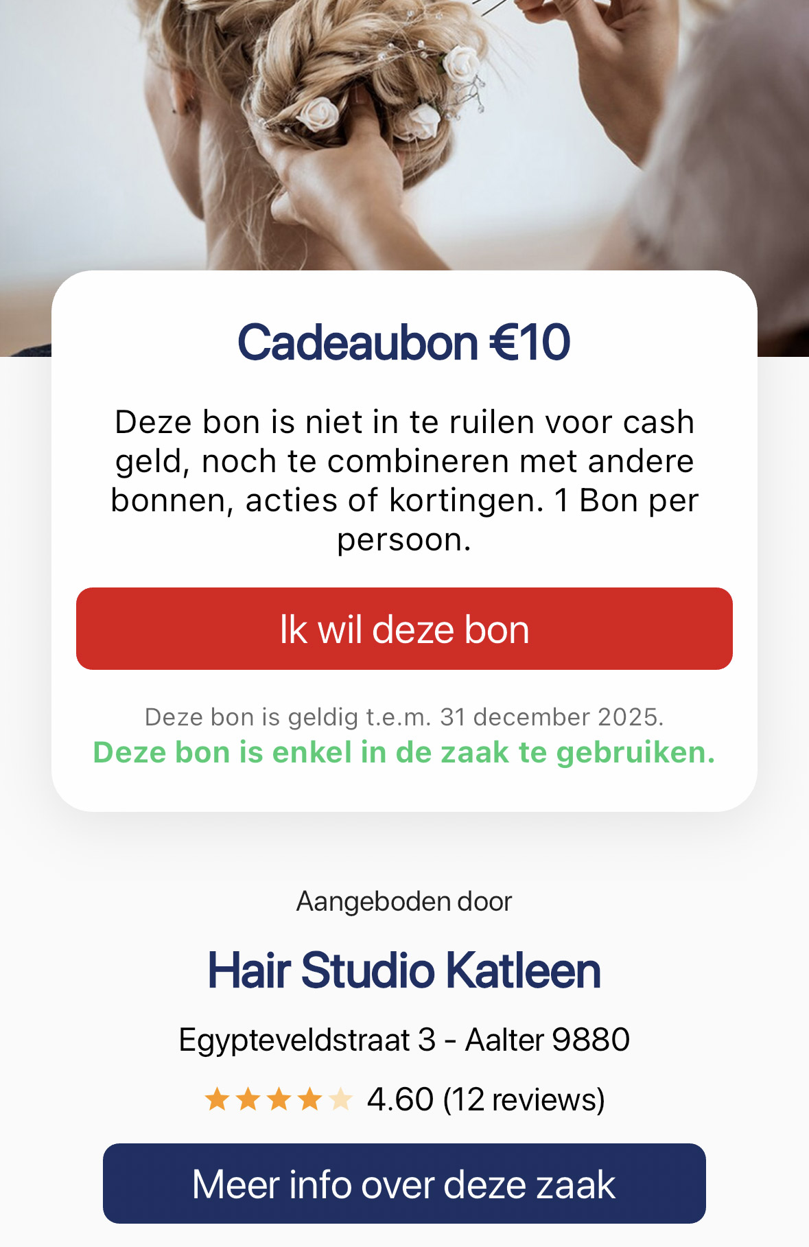 Als je in het overzicht van de bonnen tikt op "Meer info" kun je de voorwaarden van de bon bekijken en bij welke zaak deze geldig is. Je kunt een bon reserveren door op de rode knop "Ik wil deze bon" te tikken. Je krijgt een bevestiging te zien als dit gelukt is. Deze bon wordt nu opgeslagen onder "Mijn bonnen" deze kan je op een later tijdstip gebruiken in de zaak.