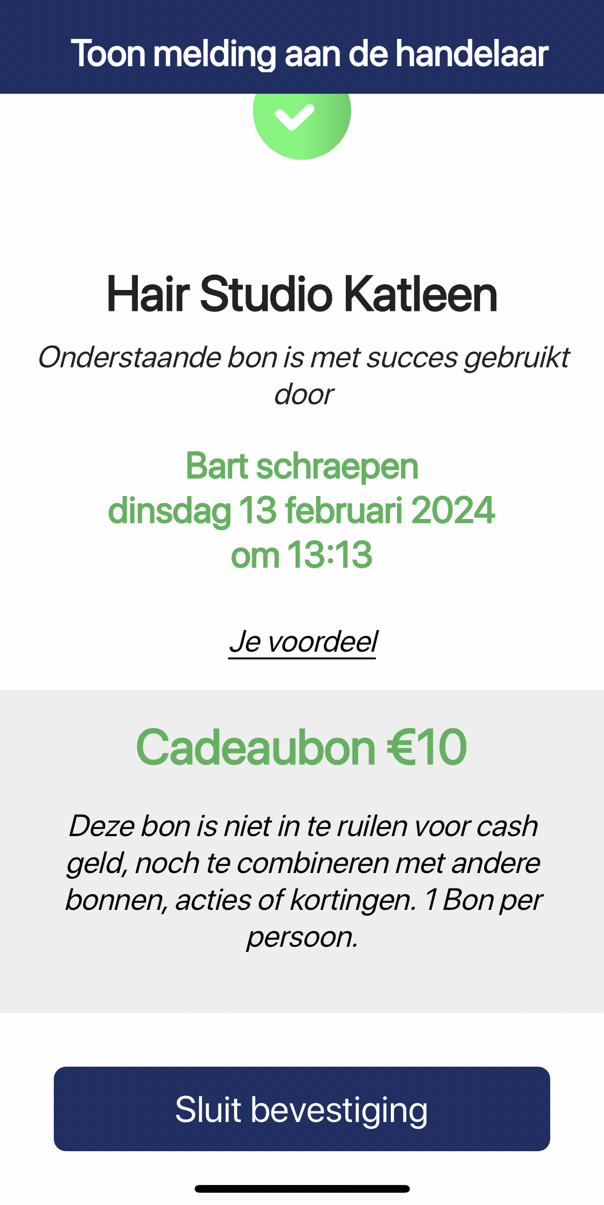 Als je de QR-code gescand hebt, wordt er een bevestiging getoond. Deze melding toon je in de zaak. Hierop staat in het groen dat de bon correct gebruikt is samen met het tijdstip en de gegevens op. Je bent nu klaar en je kan genieten van het voordeel dat op de bon vermeld staat.